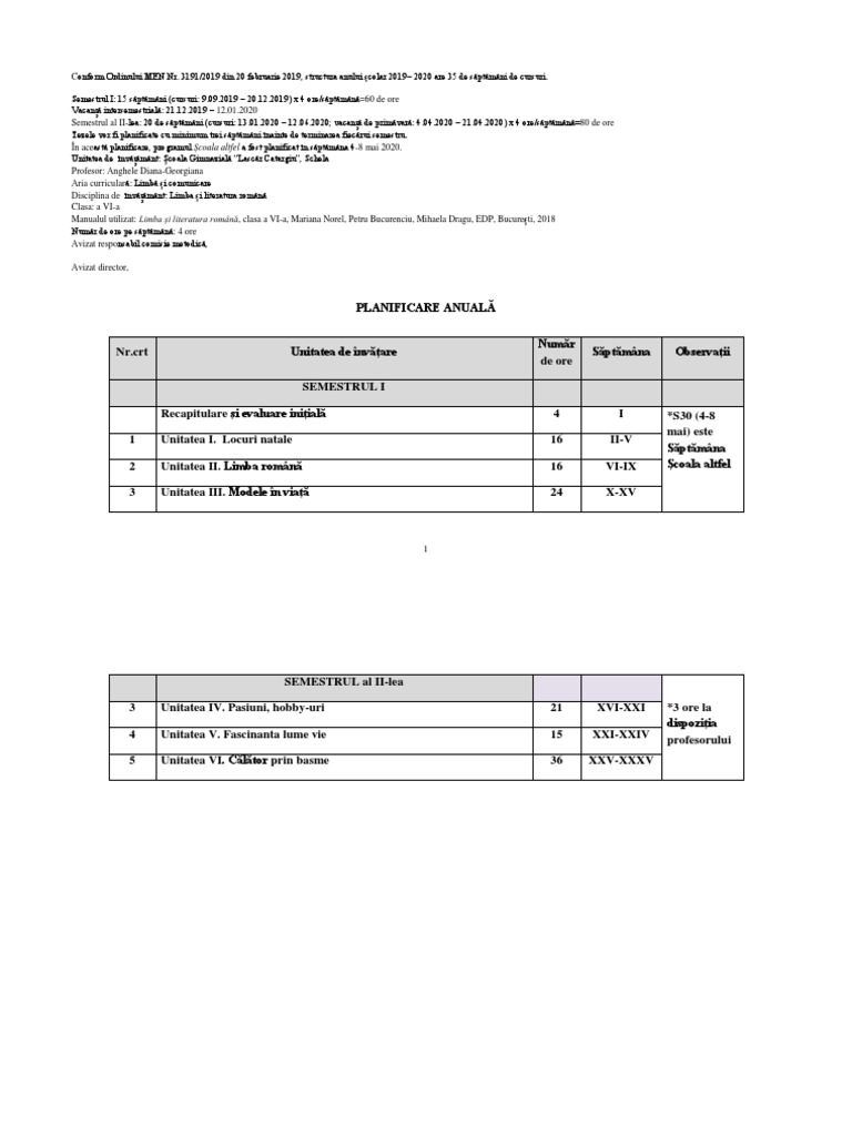 Planificare Completa Anuala Calendaristica Pe Unit De Invatare Clasa A 6 A Docx