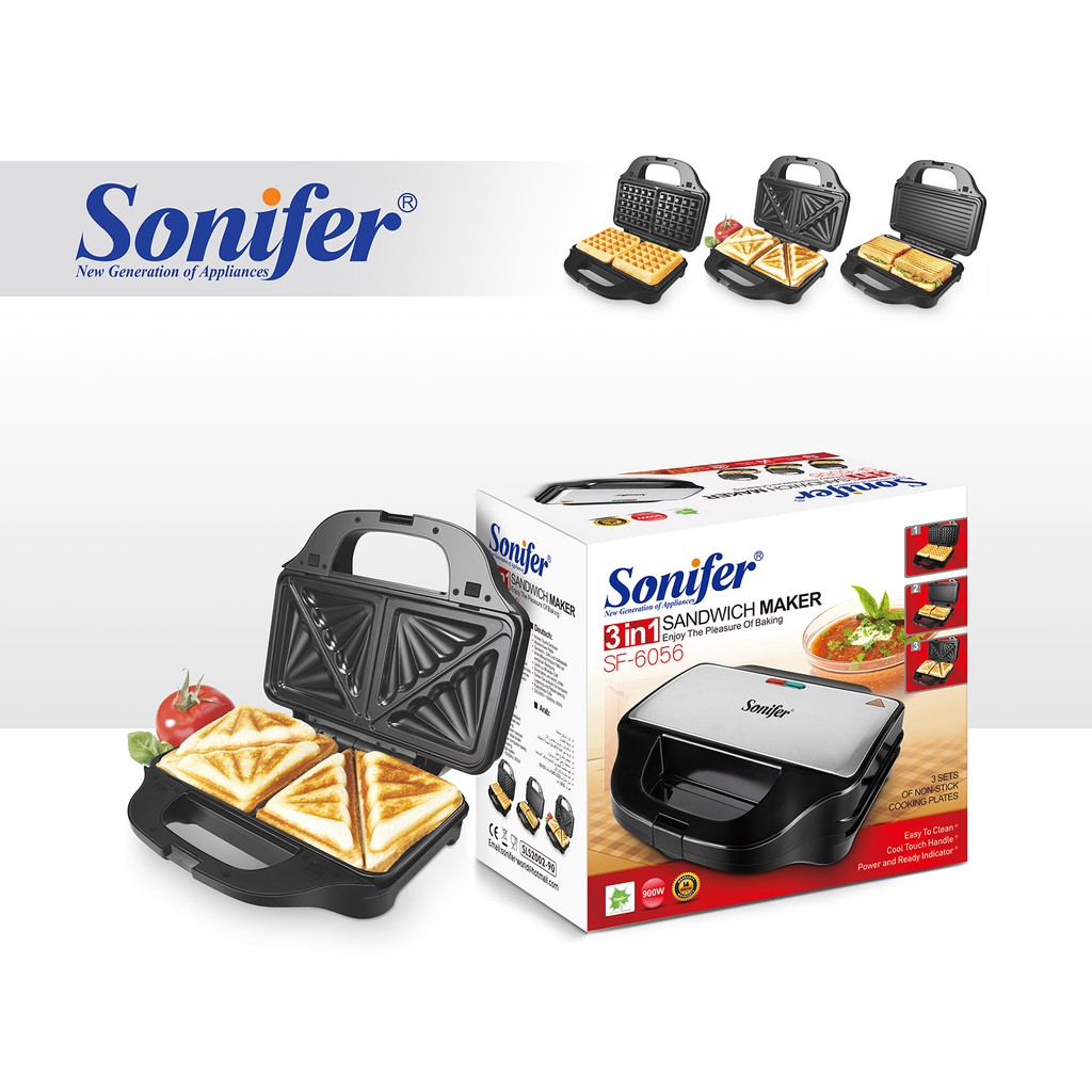 Sonifer sandwich maker 3 in 1. Sonifer operates export business of small home appliances of its own brand including electric kettles meat grinders juicers blenders electric irons hair dryers hair stylers sandwich makers hand mixers coffee makers coffee grinders coffee pots choopers food processors heaters and other kitchen appliances and personal care appliances. Sf 6050 sonifer multi functional detachable plate sandwich maker 3 in 1 plate can be choose detachable plate cool touch housing sandwich grill and waffle plate non stick coated.