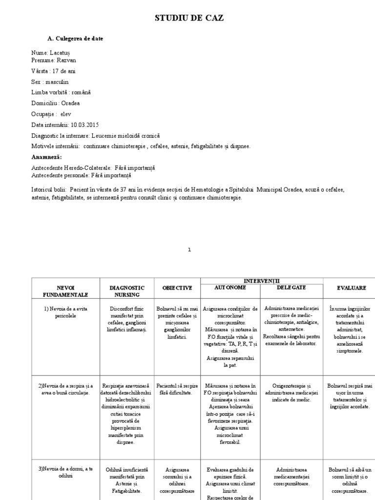 Studiu De Caz Plan De Ingrijiri A Bolnavului Cu Leucemie