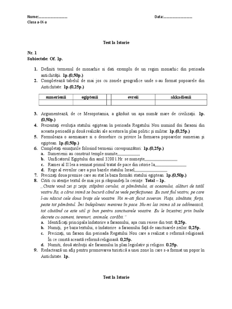 Test La Istorie Cls 9 Popoarele Orientului Antic