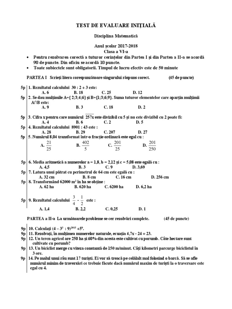 Test De Evaluare Intiala Clasa A 6 A Matematica