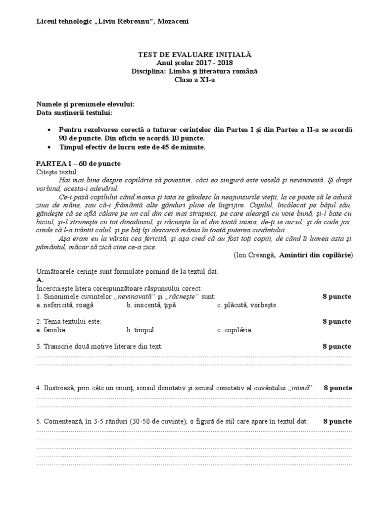 Test De Evaluare Initiala Clasa A Ixa