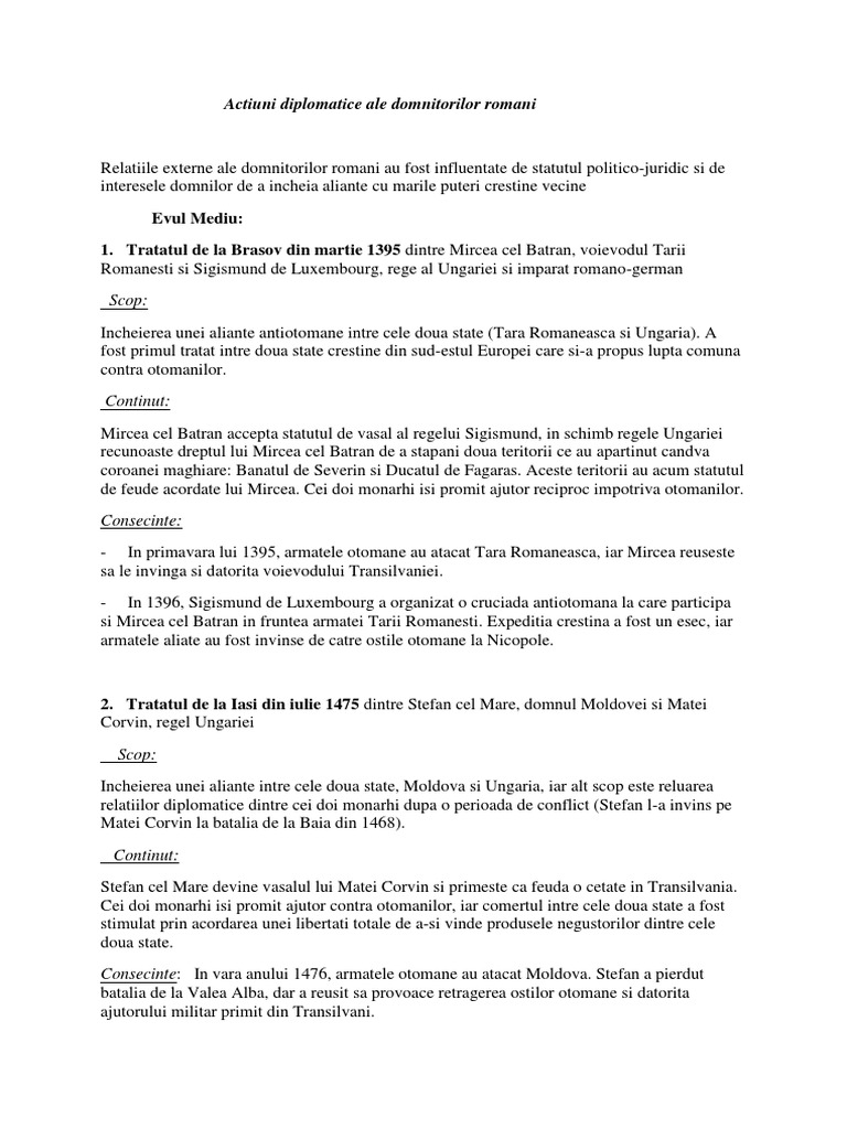 Actiuni Diplomatice Ale Domnitorilor Romani