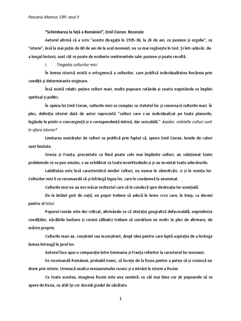 Schimbarea La Fata A Romaniei Cioran Recenzie